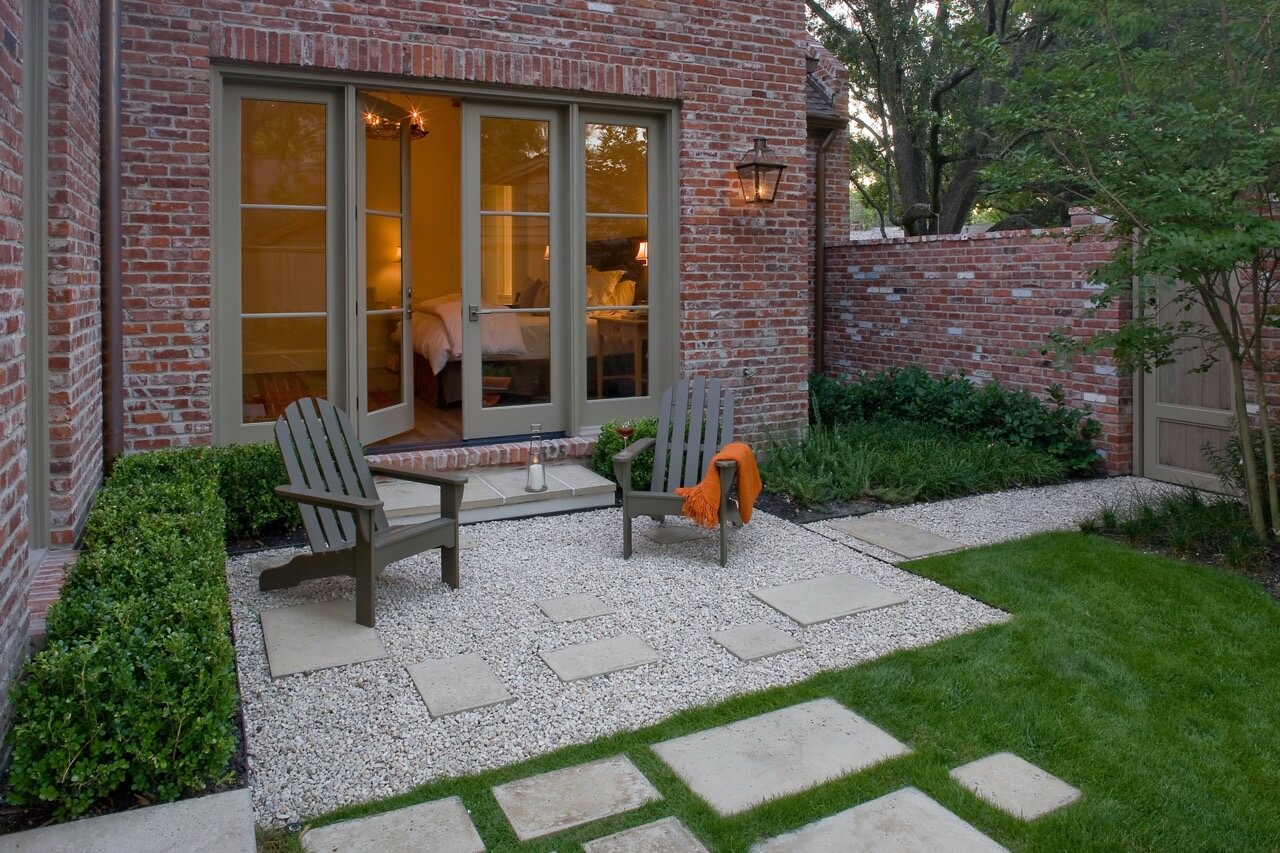 Just around the corner from the back entrance to the house, there lies a double-door entrance to the master bedroom. This was an ideal place to build a small patio for the Boyles to use as a private seating area in the early mornings and evenings. We deviated slightly from strict linearity and symmetry by adding pavers that ran out like steps from the patio into the grass. We then planted boxwood hedges around the patio, which are common in French country garden design and combine an Old World sensibility with a morning garden setting.