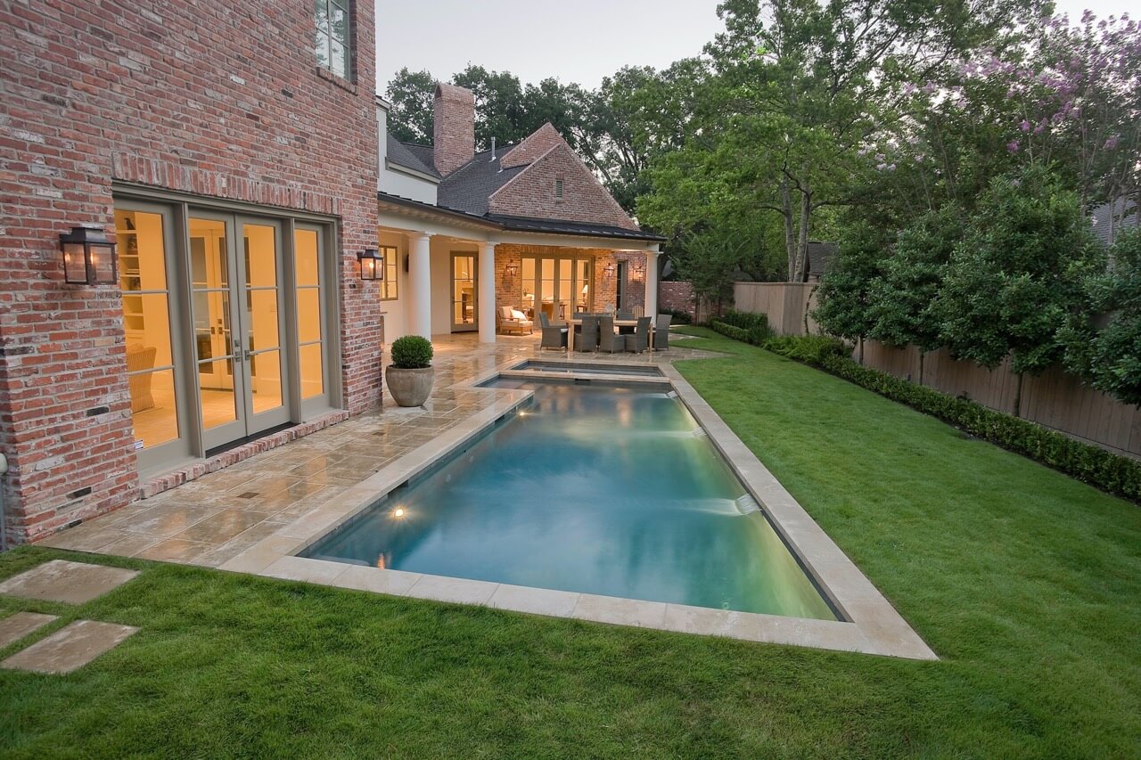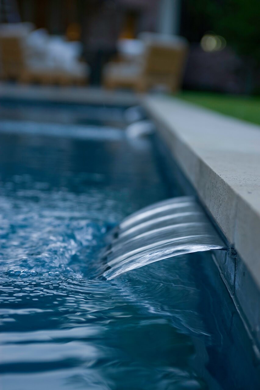 The aesthetic we ultimately created for them was not a traditional French country garden per se, but instead was a variation on the symmetry, color, and sense of formality associated with this design. The most notable feature that we added to the estate was a custom swimming pool installed just to the rear of the home. It emphasized linearity, complimentary right angles, and it featured a luxury spa and pool fountain. We built the coping around the pool out of limestone, and we used concrete pavers to build the custom pool patio. We then added French pottery in various locations around the patio to balance the stonework against the look and structure of the home.