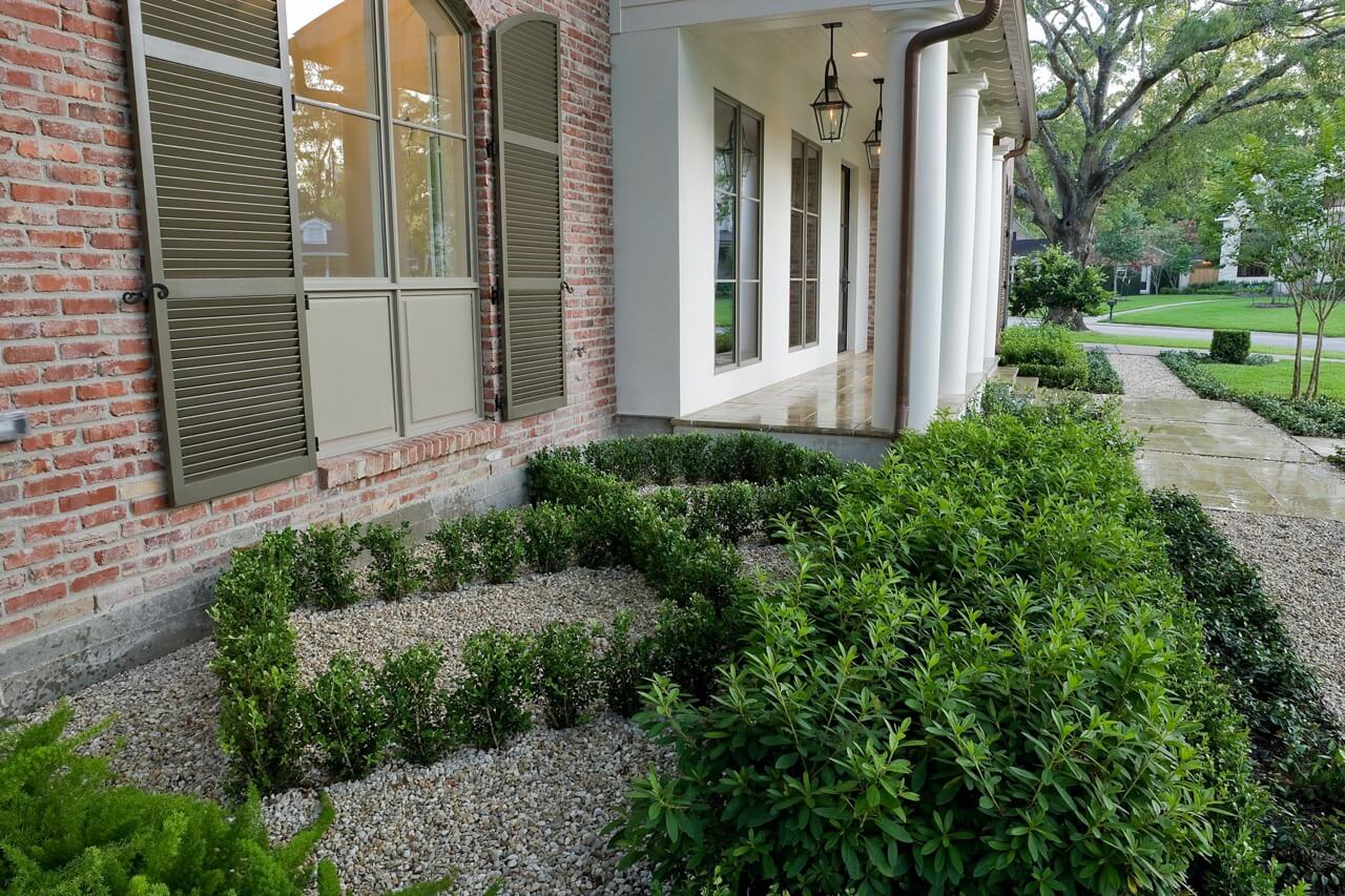 We then landscaped the front of the home with a continuing symmetry reminiscent of French country garden design. We wanted to establish a sense of grand entrance to the home, so we built a stone walkway that ran all the way from the sidewalk and then fanned out parallel to the covered porch that centers on the front door and large front windows of the house. To further develop the sense of a French country estate, we planted a small parterre garden that can be seen and enjoyed from the left side of the porch.