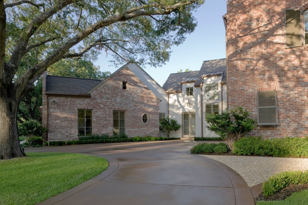 On the other side of house, we built the Boyles a circular motorcourt around a large oak tree surrounded by lush San Augustine grass. We had to employ special tree preservation techniques to build above the root zone of the tree. The motorcourt was then treated with a concrete-acid finish that compliments the brick in the home. For the parking area, we used limestone gravel chips.