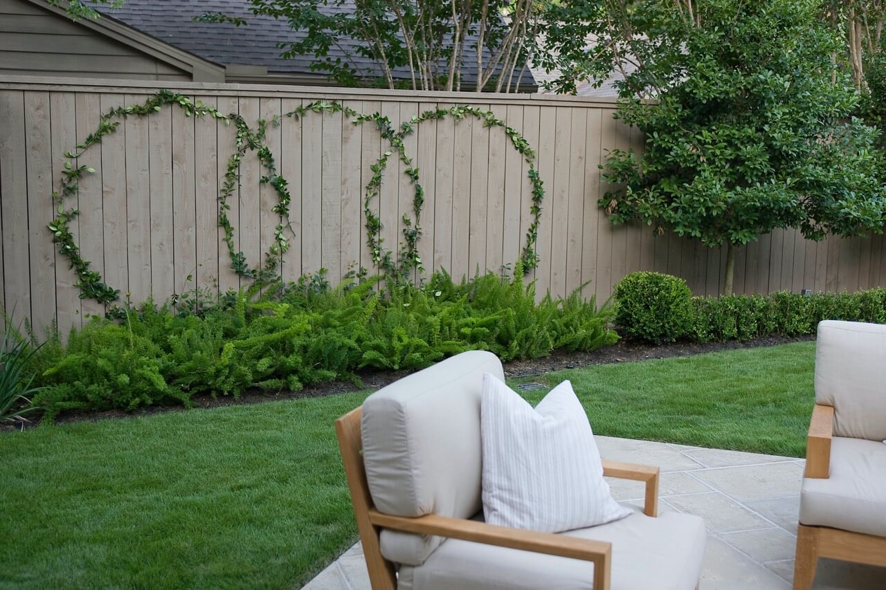 We added a formal garden parallel to the pool to reflect its linear movement. Like most French country gardens, this design is bordered by sheered bushes and emphasizes straight lines, angles, and symmetry. One very interesting thing about this garden is that it is consist entirely of various shades of green, which lends itself well to the sense of a French estate. The garden is bordered by a taupe colored cedar fence that compliments the color of the stonework.